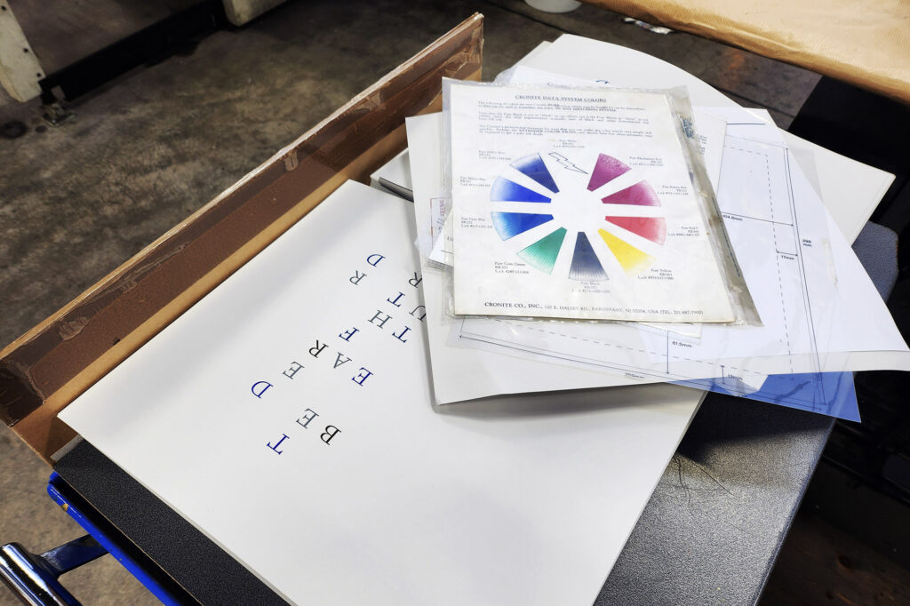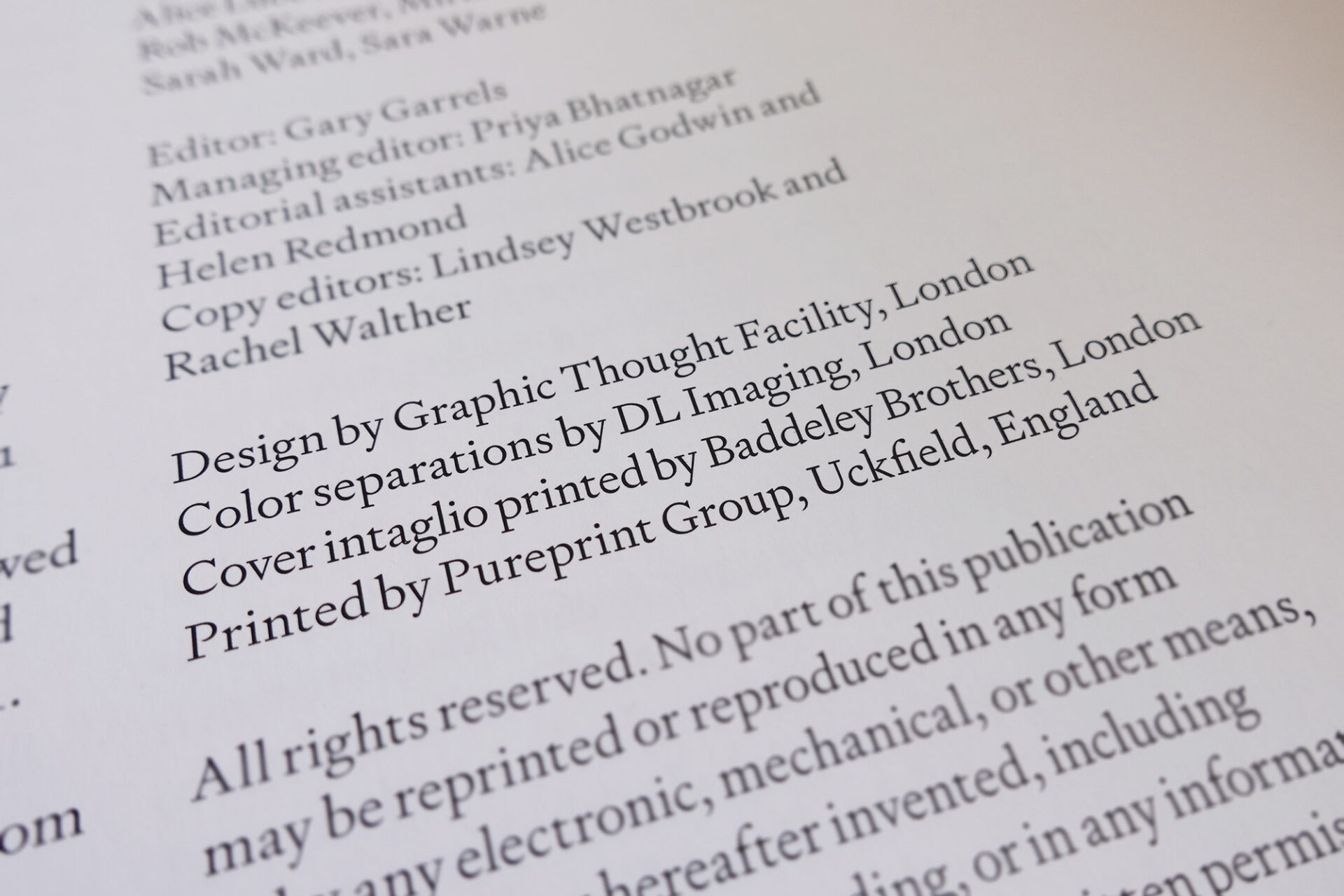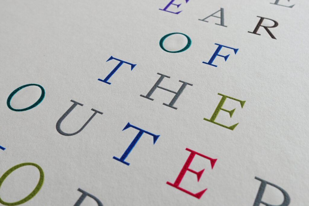 The challenge to find a cover design solution that is both reflective of the curator’s over-arching concept, and a democratic representation of the exhibited artists (not emphasising one over another) is to use type-only, and Paul contacted Baddeley Brothers with a very clearly-defined brief—intaglio printing.